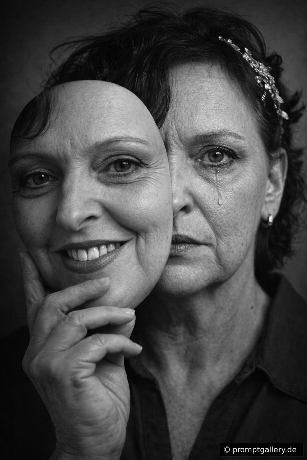https://chatgpt.comErstelle ein hochrealistisches Schwarz-Weiß-Porträt eines Menschen (Referenzbild1:1, Gesichtszüge und Haare übernehmen), frontal zur Kamera. Die Komposition zeigt zwei Ebenen derselben Person: Im Vordergrund hält die Person mit einer Hand eine Maske vor das Gesicht. Die Maske zeigt ein sanftes, leichtes Lächeln des exakt gleichen Gesichts der Person des Referenzbildes. Hinter der Maske ist das echte Gesicht der Person sichtbar: ernster, nachdenklicher Ausdruck, direkter Blick zur Kamera. Aus einem Auge läuft eine einzelne Träne langsam über die Wange. Details: extrem realistische Hautstruktur mit sichtbaren Poren, feinen Linien und natürlichen Unregelmäßigkeiten. Klare Augen mit realistischen Lichtreflexen. Natürliche Haarstruktur, keine Retusche, keine Glättung. Beleuchtung: weiches, gleichmäßiges Studio-Licht von vorne oder leicht seitlich, dezente, realistische Schatten. Stil: fotografisch realistisch, dokumentarisch, zeitlos. Ruhiger, unscharfer Hintergrund, geringe Tiefenschärfe. Atmosphäre: innere Zerrissenheit, Dualität von äußerer Fassade und innerer Emotion, ruhig, intensiv. Schwarz-Weiß, hohe Detailtiefe, Ultra-Realismus, Sharp Focus, kinoreife Bildwirkung.