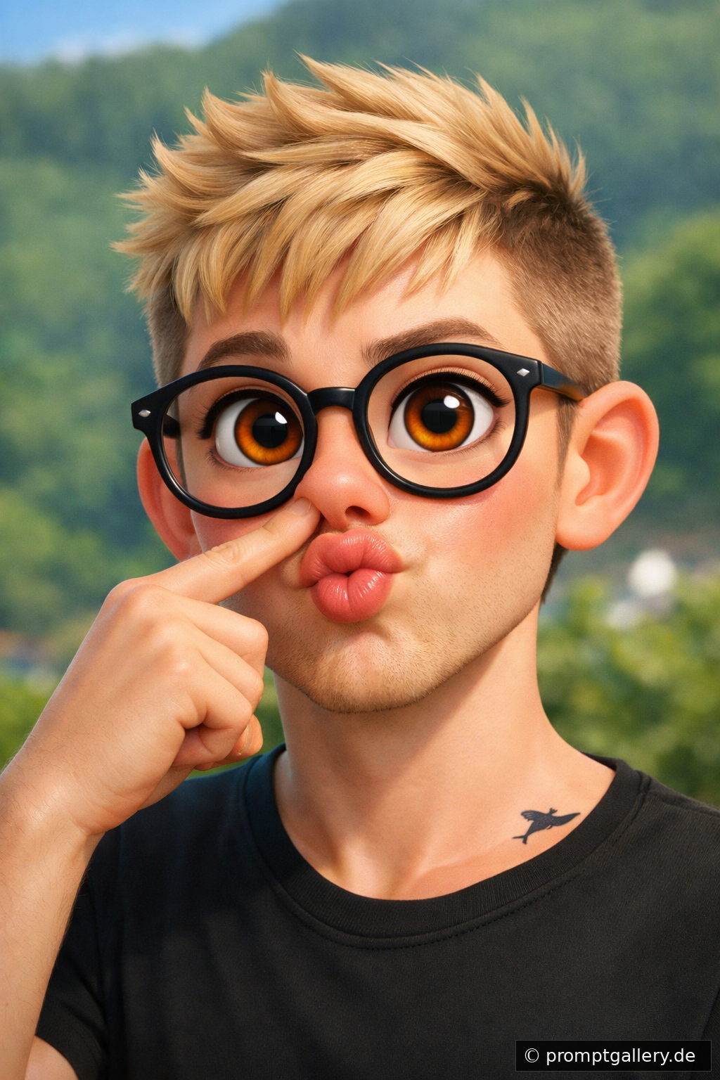 Erstelle aus diesem Photo ein Bild auf die diese Aussage zutrifft: Die Person hat: kurze, seitlich rasierte Haare mit voluminösem, blondem Deckhaar große runde schwarze Brille auffällig große, orange-braune Augen die Lippen spitz zusammengezogen („Kussmund“) einen Finger, der verspielt in ein Nasenloch gesteckt wird 😅 ein kleines Tattoo am Schlüsselbein schwarzes Oberteil Der Stil wirkt wie eine Mischung aus Pixar-/3D-Animationscharakter und Social-Media-Avatar: glatte Haut, weiche Schatten, übertriebene Proportionen, sehr saubere Details. Die Mimik vermittelt Humor, Frechheit und eine leicht alberne, selbstironische Stimmung.