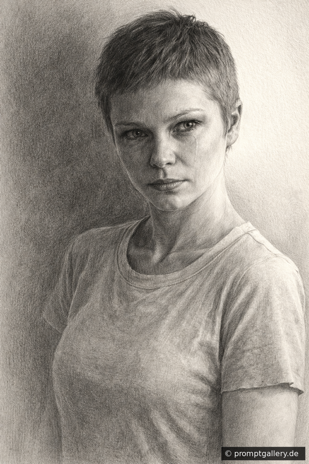 Erstelle anhand diesen Bildes eine Realistische, hochdetaillierte Bleistiftzeichnung einer emotional verletzten, aber innerlich starken Frau. Halbfigur oder Porträt. Ihr Blick ist tiefgründig, leicht müde, als hätte sie viel durchlebt – doch in den Augen liegt Entschlossenheit. Keine Tränen im dramatischen Sinn, sondern feuchte Augen oder ein angedeuteter, kontrollierter Schmerz. Ihre Haltung ist aufrecht, Schultern leicht angespannt, als würde sie sich bewusst zusammenhalten. Feine Schraffuren betonen Schatten unter den Augen, zarte Linien im Gesicht erzählen von Erfahrung. Das Haar fällt natürlich, leicht unordentlich. Die Lippen geschlossen, ein Hauch von Bitterkeit und Würde zugleich. Licht fällt seitlich ins Gesicht und erzeugt starke Kontraste – eine Hälfte im Schatten, eine im Licht (Symbol für Kampf und Hoffnung). Kleidung schlicht (z.B. lockeres Shirt oder Bluse), Stoffstruktur detailliert ausgearbeitet. Hintergrund minimalistisch, nur angedeutete Schattierungen. Klassischer Zeichenstil, realistische Proportionen, feine Bleistifttextur auf leicht strukturiertem Papier, monochrom, hohe Detailtiefe.