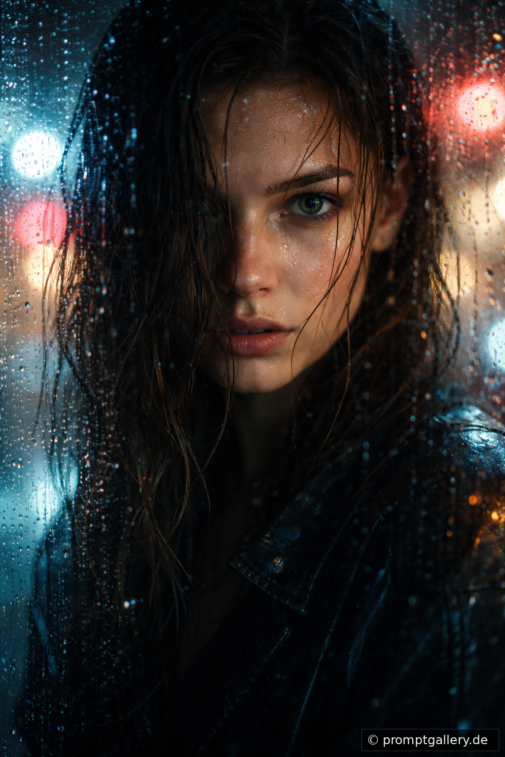 Filmisches Nachtporträt eines stilvollen Subjekts, das hinter einem regennassen Glasfenster steht. Das Subjekt blickt intensiv und fokussiert durch das Glas. Wassertropfen auf dem Glas verzerren die Neon-Stadtlichter hinter dem Fotografen und erzeugen ein stimmungsvolles Bokeh im Vordergrund. Das Gesicht wird vom weichen, farbenfrohen Licht der Straße beleuchtet, das Hauttextur und nasses Haar hervorhebt. Aufnahme mit Phase One IQ4 150MP, 85mm f/1.2. Scharfer Fokus auf das Auge des Subjekts durch eine klare Lücke in den Regentropfen. Kondensation am Glas weicht die Haut leicht, Augen bleiben stechend. 16-bit TIFF, atmosphärisch, stimmungsvoll.