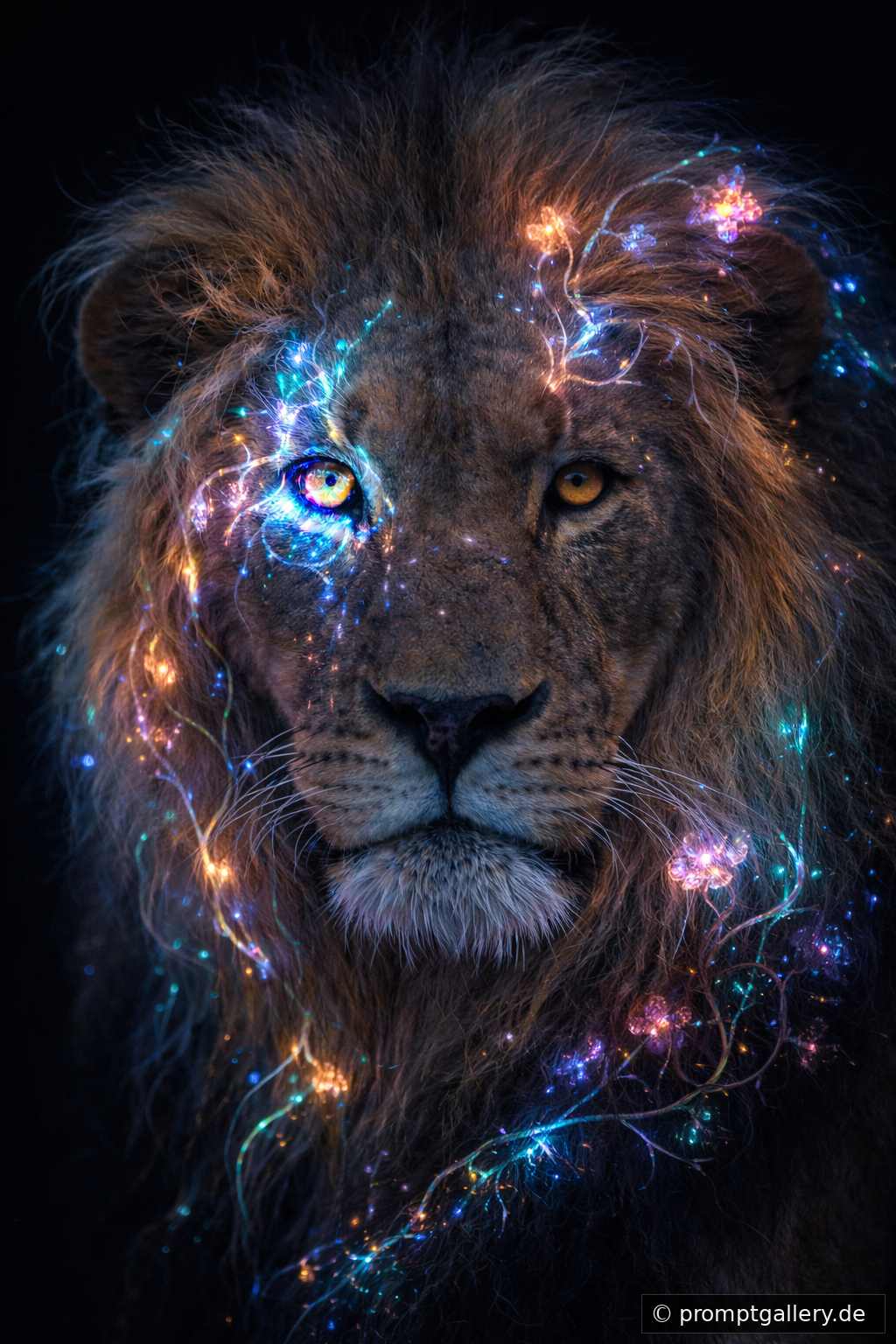 Cinematisches Löwen-Porträt in 8K: Biolumineszente Lichtakzente und neonartige Leuchtblumen durchziehen Mähne und Gesicht, ein Auge funkelt wie eine Miniatur-Galaxie – hyperrealistisch, stimmungsvoll, faszinierend.“