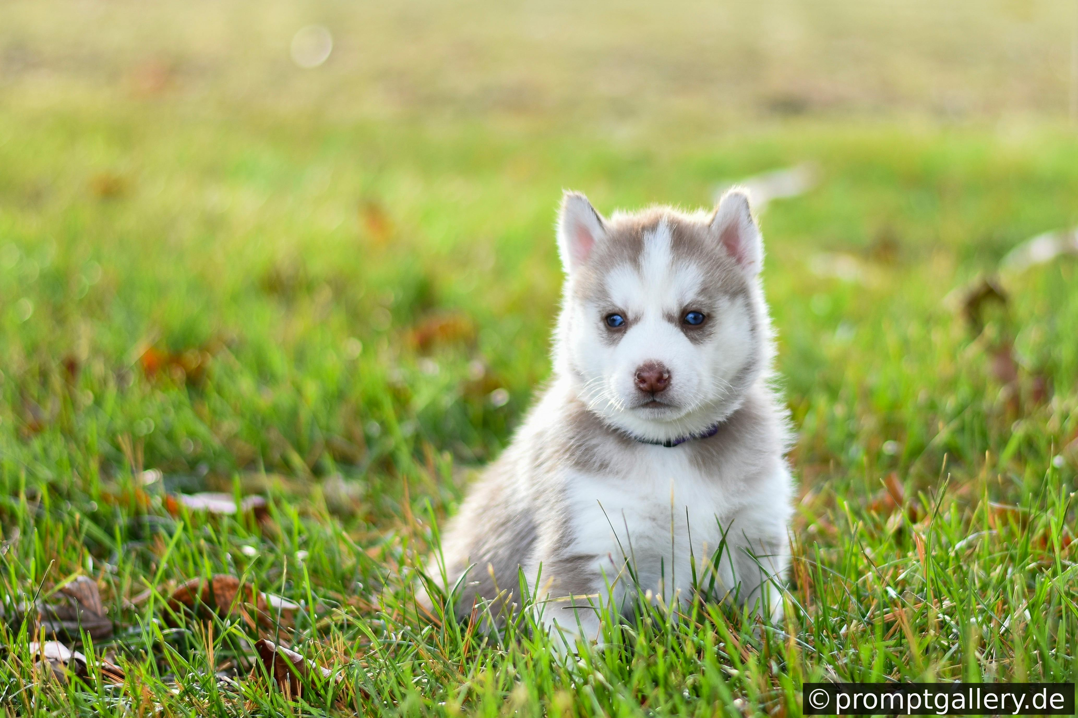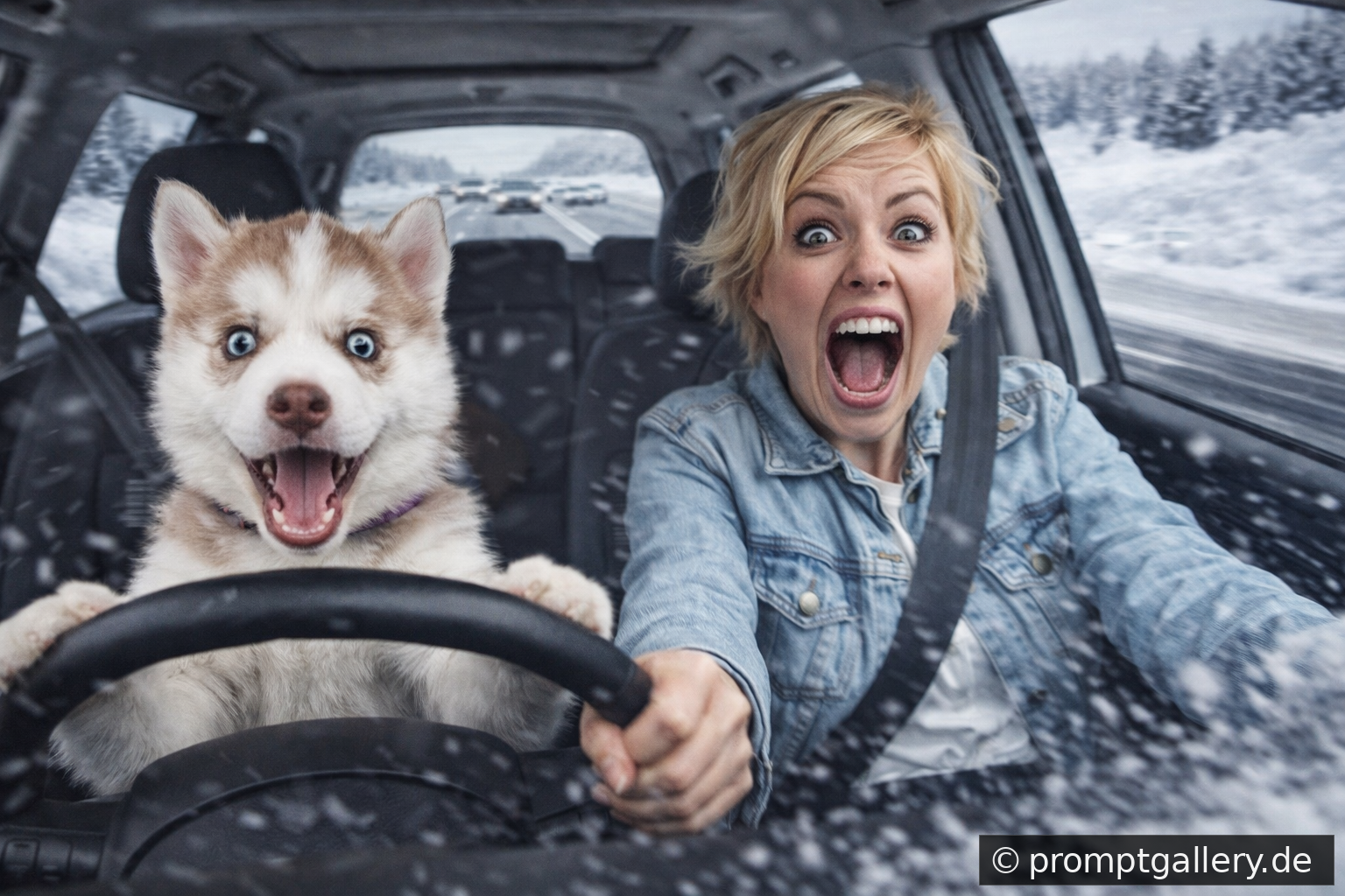 Ein silberner Kleinbus schlittert über eine verschneite Autobahn, während ein Husky-Welpe mit identischer Fellzeichnung frontal hinter dem Steuer sitzt. Neben ihm eine blonde Frau mit kurzem Haar – beide mit chaotisch-überraschten Gesichtsausdrücken