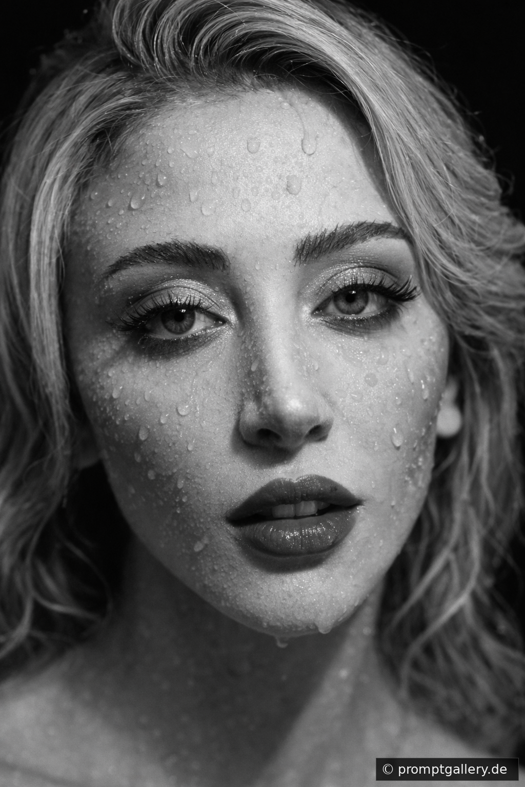 Erstelle ein kontrastreiches Nahaufnahmeporträt meines Gesichts mit Fokus auf die Vorderseite, in Schwarz-Weiß-Nahaufnahme, 35-mm-Objektiv 4K HD-Qualität. Starker Ausdruck, Wassertropfen auf meinem Gesicht, schwarzer Schattenhintergrund, nur das Gesicht ist sichtbar,