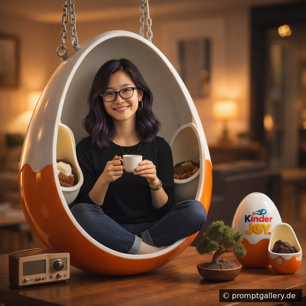 Verwende das hochgeladene Referenzfoto der Person, um Gesicht, Hautfarbe und grundlegende Ähnlichkeit realistisch nachzubilden. Erstelle eine surreale, humorvolle Szene in realistischer Fotografie. Eine Person sitzt im Schneidersitz in einem riesigen geöffneten Kinder-Joy-Ei, das wie ein hängender Eiersessel an einer Metallhalterung mit Ketten befestigt ist. Die Person sitzt entspannt im Ei und hält eine kleine Tasse Kaffee in beiden Händen. Das Ei steht auf einem Holztisch in einem gemütlichen Wohnzimmer. Neben dem großen Ei auf dem Tisch steht ein normales Kinder-Joy-Ei in Verpackung, leicht geöffnet, sodass der Größenvergleich sichtbar wird. Weitere Details auf dem Tisch: ein kleines Retro-Radio ein Mini-Bonsai-Baum warmes Wohnlicht im Hintergrund Die Szene wirkt spielerisch, surreal und humorvoll, als wäre das riesige Ei ein Designer-Sessel. Licht: warmes weiches Wohnzimmerlicht, natürliche Beleuchtung Kamera: 50mm Fotografie, leichtes Bokeh im Hintergrund Stil: hyperrealistische Fotografie Komposition: zentriert, saubere Bildkomposition Stimmung: gemütlich, humorvoll, surreal Technik: 8K, ultra high resolution, ultra detailed, depth of field, cinematic lighting, sharp focus
