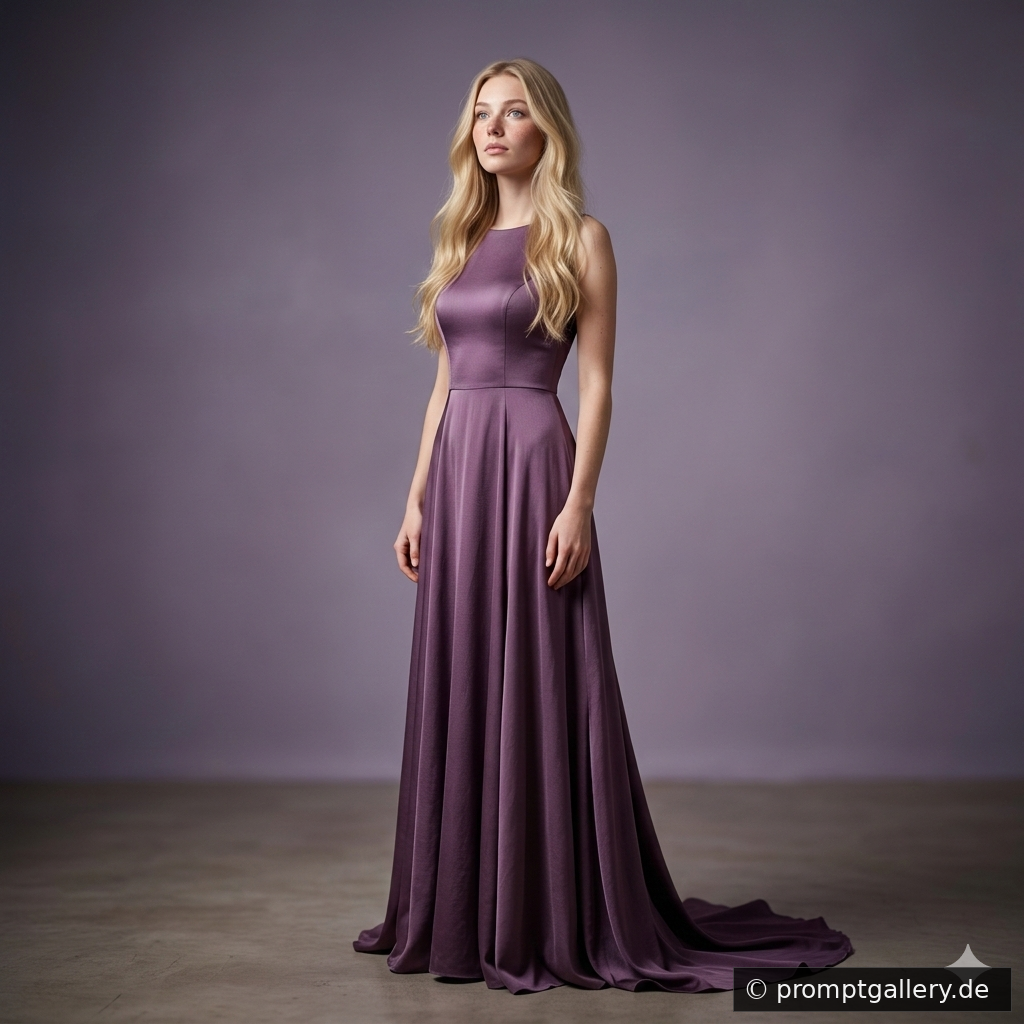 Erstelle ein hyperrealistisches, elegantes Porträt basierend auf dem hochgeladenen Referenzfoto. Sie trägt ein langes, fließendes, purpurfarbenes Abendkleid mit einem dezenten Zug am Boden. Die Pose ist aufrecht, leicht seitlich, die Hände locker an den Seiten, und ihr Blick ist selbstbewusst und leicht nach oben gerichtet. Das Gesicht, die Hautfarbe und die Frisur sollen exakt dem Referenzbild entsprechen. Die Szene ist minimalistisch, mit sanfter Beleuchtung, neutralem Hintergrund in violett-lila Tönen, leicht unscharf, um Tiefe zu erzeugen. Der Fokus liegt auf der Frau, der Stoff des Kleides zeigt realistische Falten und Texturen. Die Gesamtstimmung soll elegant, professionell und zeitlos wirken. Stilhinweise: Hyperrealistisch, fotografische Qualität Weiches, diffuses Licht, Studio-Setup Hohe Detailtreue bei Gesicht, Haaren und Kleid Dezente Vignettierung für mehr Fokus auf die Person