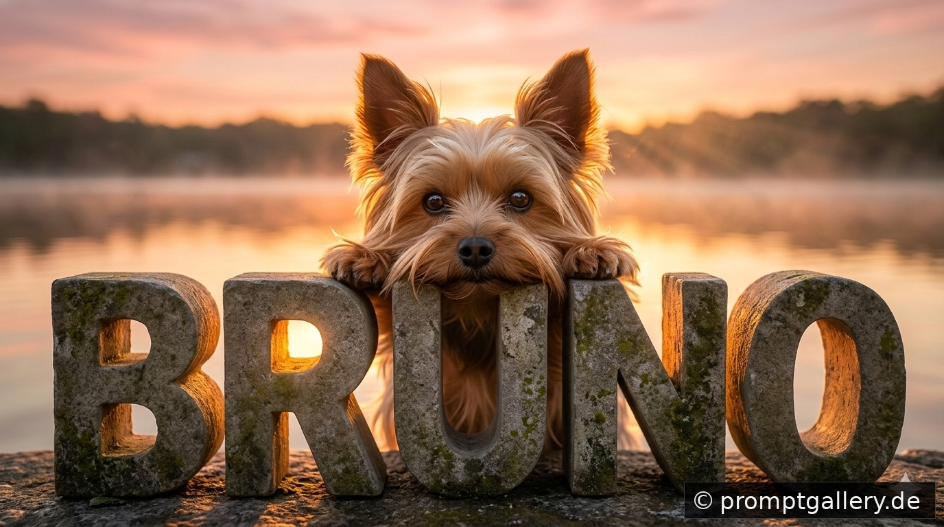 https://chatgpt.comA dog (same dog as reference, natural look, short smooth blue-gray coat, subtle white chest marking) resting behind massive hollow 3D stone letters spelling the full word “BRUNO” — the entire name BRUNO must be fully visible and correctly spelled. The dog’s front paws and forearms are draped over the top of one large stone letter, and his head is gently resting directly on top of the same stone letter between his paws, clearly supported by the letter. He is looking directly into the camera with a calm, regal, gentle expression. Relaxed posture. Golden hour sunset with the sun positioned slightly behind and to the side, casting strong warm sunlight directly onto the dog’s face and upper body. The sunlight creates a soft glowing rim light around his ears and head, warm highlights on his fur, and natural golden reflections in his eyes. Dramatic sun rays illuminating the dog more prominently than the background. Massive realistic stone letters with natural texture, weathered surface, cinematic scale. Positioned at the edge of a calm lake. Warm orange and pink sky reflecting in the water. Soft mist over the lake. Realistic water reflections and subtle ripples. Ultra-detailed fur, sharp focus on the dog’s face, shallow depth of field, creamy bokeh background. Dramatic but elegant composition. Professional photography, 85mm lens look, natural cinematic color grading, high dynamic range, ultra-realistic, 8K resolution, masterpiece. Landscape orientation (Querformat), wide cinematic framing.
