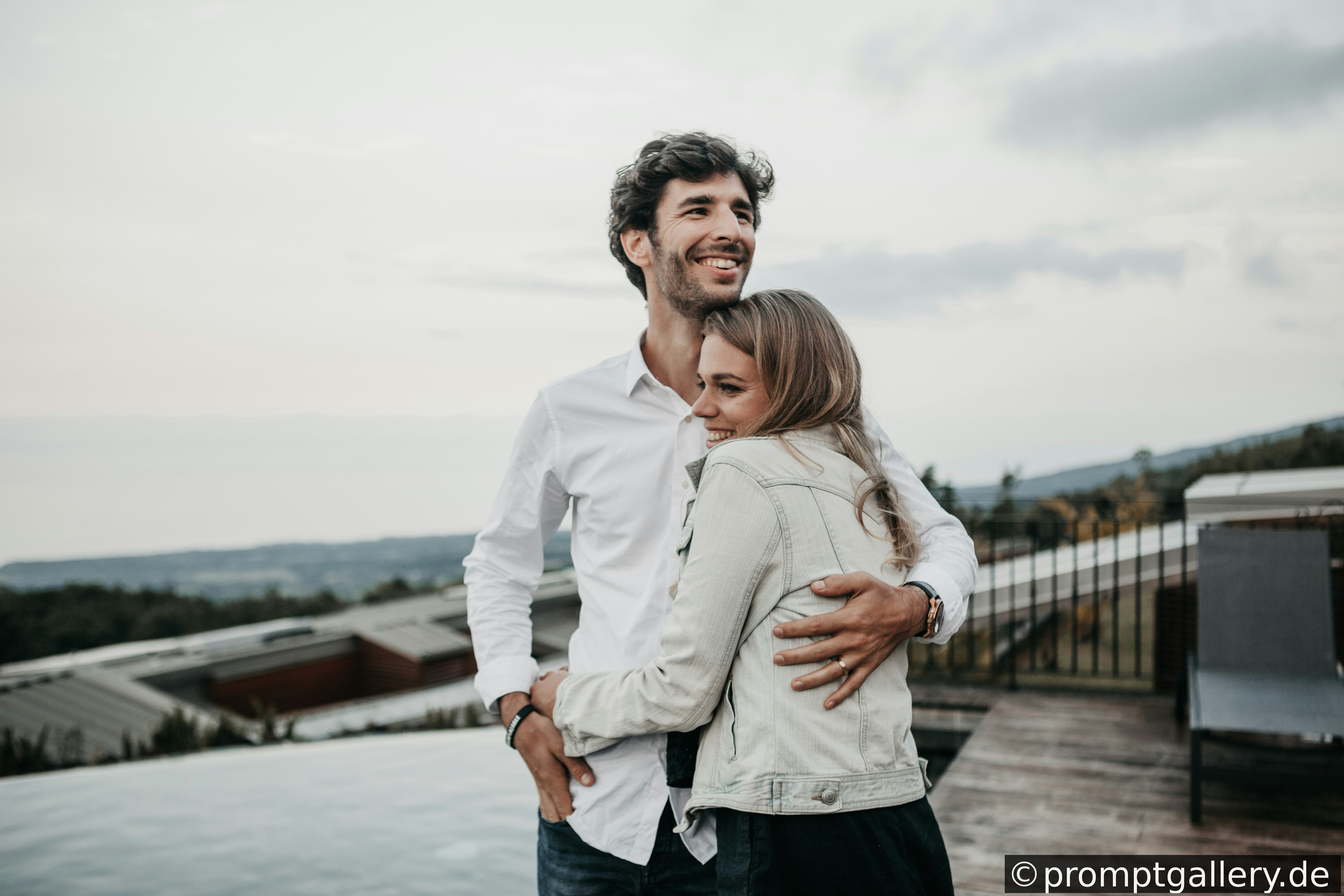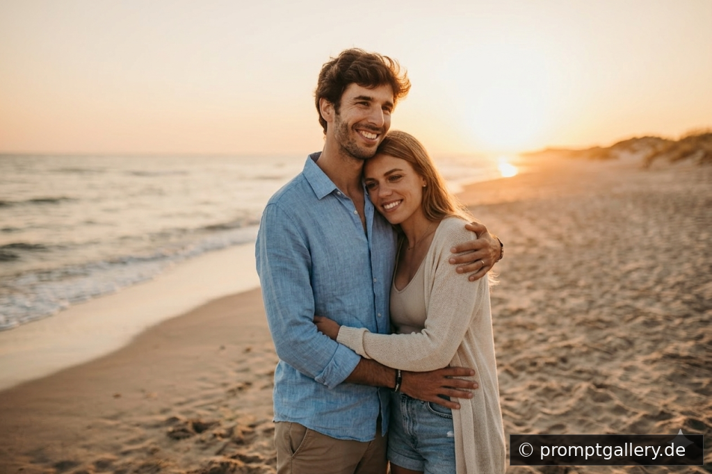 Mann und Frau umarmen sich lächelnd an einem Sandstrand bei Sonnenuntergang, warmes Gegenlicht, legerer Urlaubs-Look.