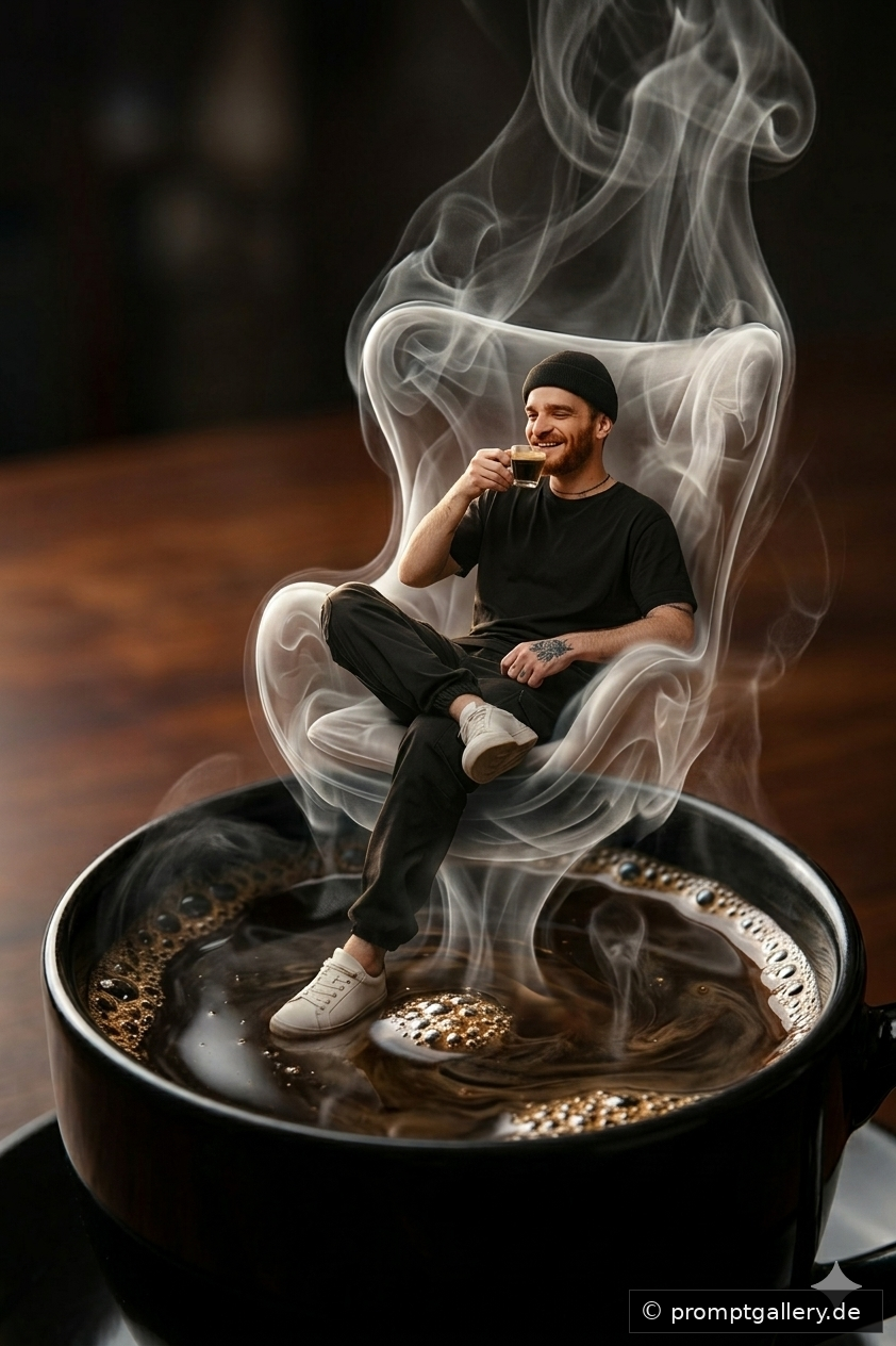 Hyperrealistische, surrealistische Makro-Fotografie-Komposition. Eine riesige Tasse tiefschwarzen, dampfenden Kaffees füllt den Bildvordergrund. Der aufsteigende, volumetrische Kaffeedampf formt sich detailreich und physikalisch glaubwürdig zu einem eleganten, weich geschwungenen Sessel aus dichter, wirbelnder Dampfsäule der über der Tasse schwebt. In diesem vollständig aus Dampf geformten Sessel sitzt ein winziger, super-miniaturisierter Mann (verwende das hochgeladene Foto 1:1 als Referenz) entspannt und selbstbewusst, die Beine locker übereinandergeschlagen und trinkt Kaffee aus einem Becher.Er trägt weiße Sneakers. Die Szene zeigt extreme Texturtreue: mikroskopisch schimmernde Kaffeeblasen, dynamische Flüssigkeitswirbel an der Oberfläche und fein ausgeleuchtete, transparente Dampfschichten, die den Sessel plastisch definieren. Dramatisches, filmisches Licht mit starkem Rim-Light von hinten betont sowohl das Profil des Miniaturmannes als auch die Konturen des Dampfsessels.Der Hintergrund besteht aus cremigem, starkem Bokeh eines edlen, dunklen Holztisches in gedämpfter Atmosphäre. Ultra-detailliert, fotorealistisch, 8K, cineastisch, mit beeindruckender Tiefenschärfe und makroskopischer Präzision