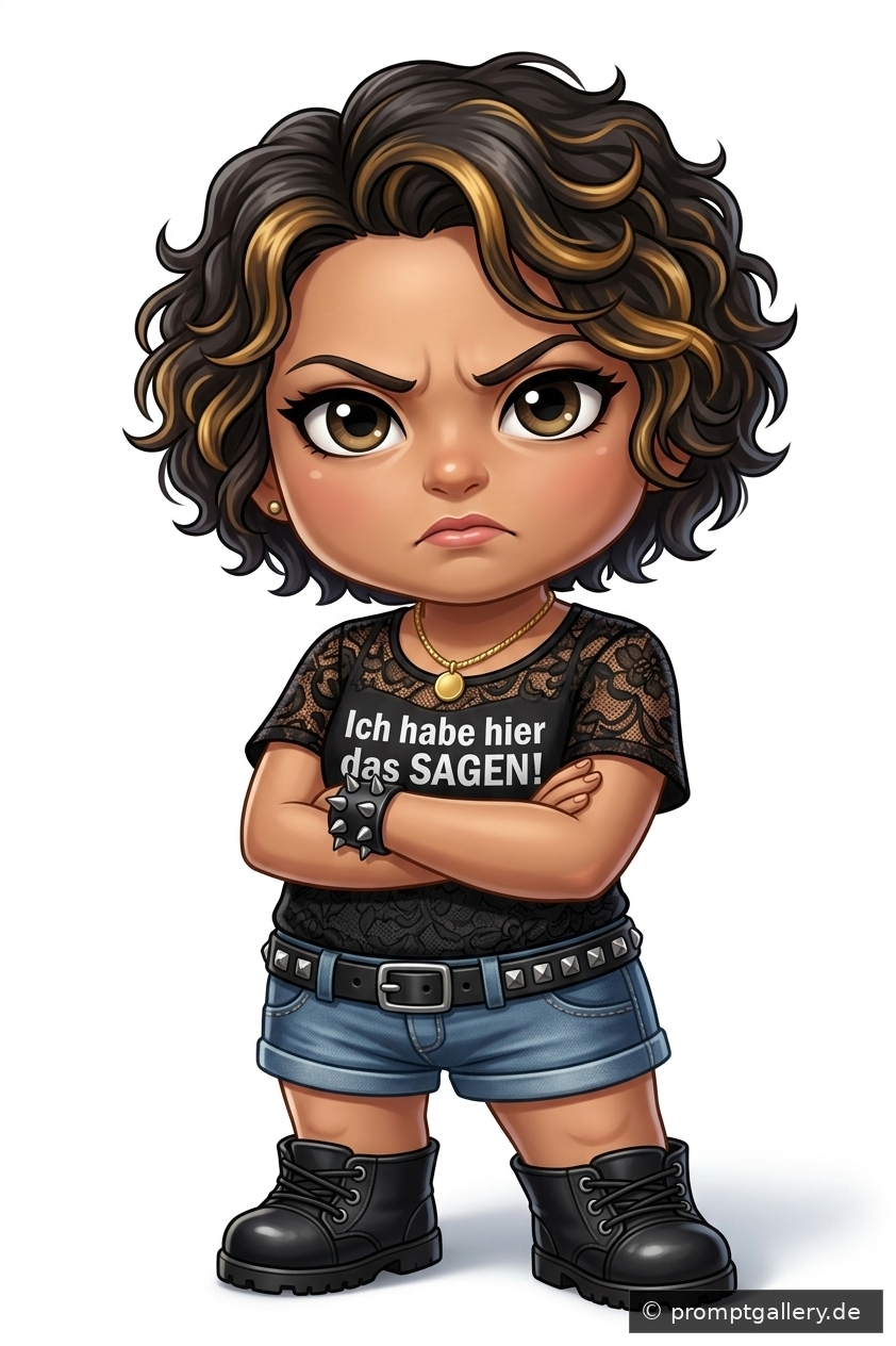 Erstelle folgendes Bild aus dem beigefügten Bild als Referenz ### Kunststil: Eine hochwertige, digitale Chibi-Charakter-Illustration (großer Kopf, stämmiger Körper) im Stil einer Premium-Sammelfigur. ### Charakter-Merkmale: * **Identität:** Die spezifische erwachsene Frau aus dem Bild, erkennbar an ihren Gesichtszügen. * **Haare:** Aus dem Referenzbild übernehmen * **Ausdruck & Pose:** Ein intensiver, mürrischer und missbilligender Blick, direkt in die Kamera, mit verschränkten Armen über der Brust, um eine ernste und konfrontative Haltung einzunehmen. ### Kleidung & Details: * **Oberteil :** Das schwarze Spitzentop aus dem Bild, bedruckt mit dem genauen deutschen Text: "Ich habe hier das SAGEN!" , deutlich lesbar in weißer Schrift. * **Unterteil:** Denim-Shorts mit einem Gürtel mit silberner Schnalle und Nieten. * **Schuhe:** Schwarze, derbe Schnürstiefel (Combat Boots). ### Komposition & Hintergrund: * Ein sauberer, isolierter weißer Hintergrund mit einem sehr subtilen, weichen Bodenschatten. * Der gesamte Charakter steht zentriert und nach vorne gerichtet. ### Technische Parameter: Extrem sauberer Render, sehr scharf, hochwertige Texturdetails (Spitze, Tweed, Denim, Metallglanz), fotorealistische Chibi-Proportionen (ähnlich einer Funko Pop- oder Nendoroid-Figur).