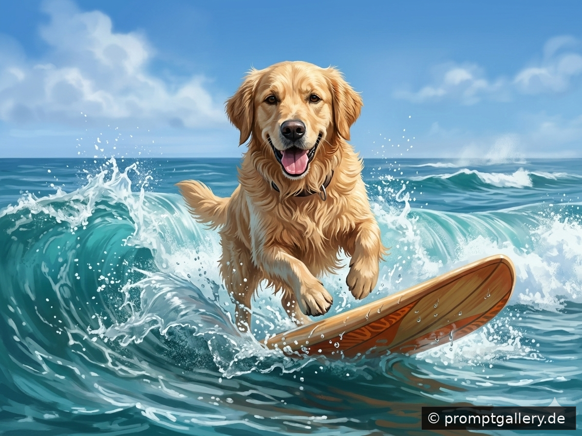 Farb-Bild, malerisch/illustrativ wie hochwertige Konzeptkunst, sichtbare Pinselstruktur, high detail, sharp subject, 8k render look, dynamische Action-Szene auf dem Meer: Ein Hund (Referenzbild) surft auf einem Surfboard durch eine brechende Welle, fröhlicher Ausdruck, Maul offen, Zunge sichtbar, Ohren aufgestellt. Low angle / leicht von unten, als ob die Kamera knapp über der Wasseroberfläche ist, der Hund kommt dem Betrachter entgegen (Bewegung nach vorn), Vorderpfoten leicht angehoben, Wasser spritzt realistisch. Cinematic lighting, sonniger Tag, soft shadows, klare Highlights auf Spritzwasser, kühle Türkis- und Cyan-Töne im Wasser, kräftiger blauer Himmel mit weichen weißen Wolken, Hintergrund: offenes Meer mit weiteren Wellenkämmen, dezente Gischt in der Ferne, keine Stadt/keine Boote, atmosphärische Tiefe. Surfboard mit sichtbarer Unterseite und warmem Akzent (z. B. orange/holz), nasse Texturen, Tropfen und Schaum detailliert, starke Bewegungsenergie, leichtes Motion-Feeling im Wasser (nicht am Motiv). Referenzbilder: Nutze Referenzbild für das exakte Aussehen des Hundes