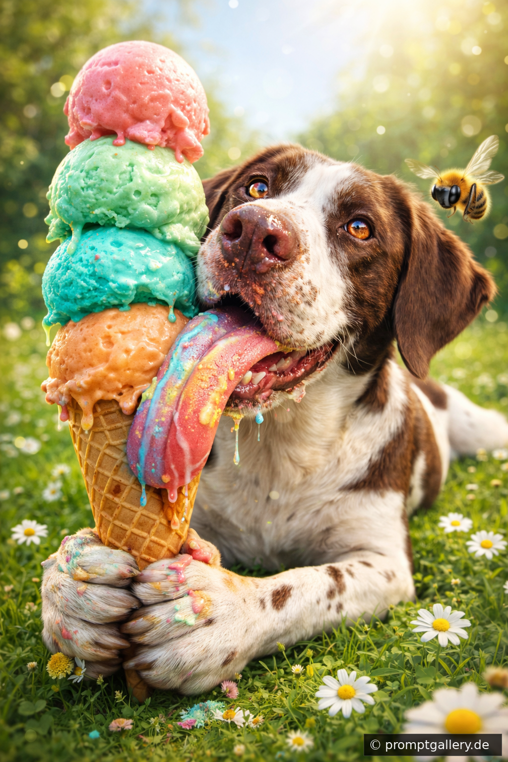 https://chatgpt.comErstelle ein fotorealistisches, surreal leicht disney-haft überzeichnetes Hochformat-Porträt im Froschperspektive eines Hundes mit identischer Fellstruktur wie im Referenzbild, same dog as reference image, exact fur pattern replication, true fur pattern preservation, identical coat texture, photographic fur fidelity, ultra realistic textures, extreme detail depth, single visible hairs, realism high, stylize low. Der Hund liegt entspannt, jedoch den Kopf aufmerksam aufrecht in die Höhe gestreckt, auf dem Bauch auf einer grünen Sommerwiese mit kleinen Gänseblümchen. Die Vorderpfoten sind natürlich nach vorne ausgestreckt und halten gemeinsam eine riesige Waffel mit vier gigantischen Eiskugeln übereinander gestapelt (rosa, mintgrün, türkis, pfirsichfarben). Das Eis ist bereits leicht angeschmolzen und tropft langsam. Kamera frontal, minimal seitlich versetzt. Der Kopf liegt leicht seitlich neben den Eiskugeln, nicht dahinter. Die Schnauze befindet sich näher zur Kamera als der Körper, jedoch ohne Weitwinkel-Verzerrung. Viel Raum über dem Kopf. Die Zunge verläuft lang und breit von der untersten bis zur obersten Kugel und ist intensiv mehrfarbig in den Farben des Eises gefärbt. Viele Eisreste kleben auf der Nase, an den Mundwinkeln, auf den Schnurrhaaren und auf den Pfoten. Leichter Sabber, glänzende nasse Nase, feuchte Barthaare. Das Fell zeigt warme Braun- und Goldreflexe mit feinen Nuancen im Schwarz und lebendiger Felltiefe. Ultra-scharfer Fokus auf Schnauze und Fellstruktur. Extrem ausdrucksstarkes Gesicht: große glasige Augen mit starken Lichtreflexen, weit geöffnete Pupillen, liebevolle neugierige Kopfneigung, zarte Stirnfalten, leicht geformter „Kussmund“. Der Ausdruck wirkt sichtbar genüsslich, als würde das Eis unglaublich gut schmecken. Cinematisches frontales Licht mit brillanten Farben, weichen Schatten und geringer Tiefenschärfe. Sonniger Sommertag im Park. Der Hintergrund ist weich verschwommen mit warmem Bokeh-Licht. Rechts leicht im Hintergrund befindet sich eine überproportional große, ultra-detaillierte, realistische, leicht verniedlichte Biene mit großen Augen. Die Biene ist klar fokussiert und blickt bewundernd auf das Eis. Sonnenstrahlen, Lichtflecken und Glanzpunkte auf den Eiskugeln. Studioqualität, 8K, surreal aber fotorealistisch, humorvolle Stimmung, dynamische Bewegung, professionelle Fotografie, High-Speed-Aufnahme. realistic dog anatomy, correct canine proportions, natural body width, natural chest proportions, body depth visible, paws close together, lens compression portrait photography, no wide angle distortion. NEGATIV-PROMPT extra limbs, extra legs, extra paws, extra ears, double eyes, deformed anatomy, mutated body, bad proportions, stretched body, horizontal distortion, wide body distortion, distorted dog body, unrealistic anatomy, missing tail, cropped paws, blurry fur, distorted face, oversharpened, noise, low quality, artifacts, watermark, text, logo, blurry bee, unfocused eyes, dull colors, flat lighting, wide angle lens, fisheye Distortion. KAMERA- & GENERATOR-SETTINGS Aspect Ratio: 2:3 Hochformat Lens: 85mm Portrait Lens Blende: f/1.8 Focus: Nose & Fur sharp Depth of Field: very shallow Reference Image Strength: 60–80 % Image / Reference Weight: 0.7–0.85 Sharpness: medium Style: photorealistic portrait photography