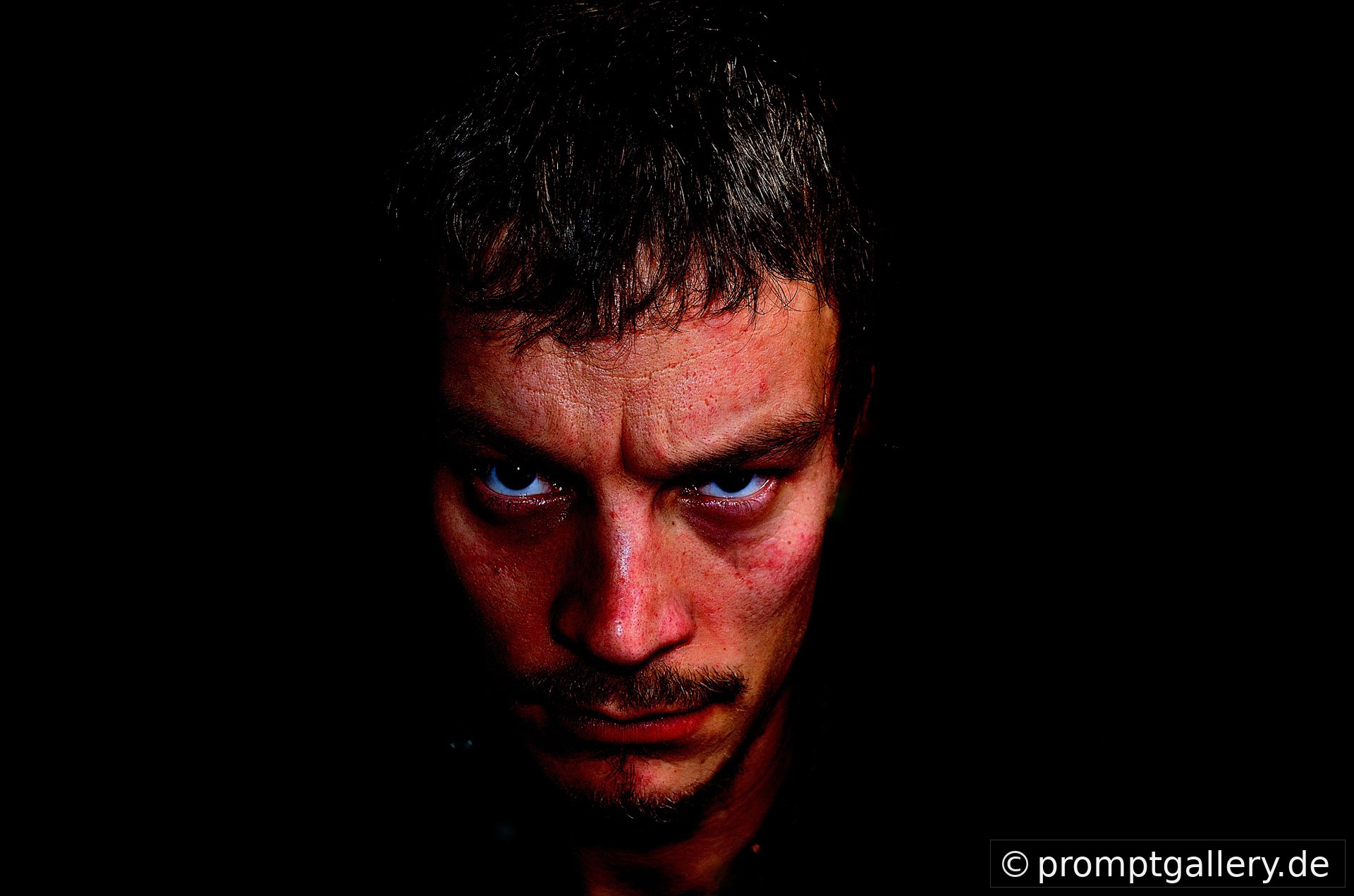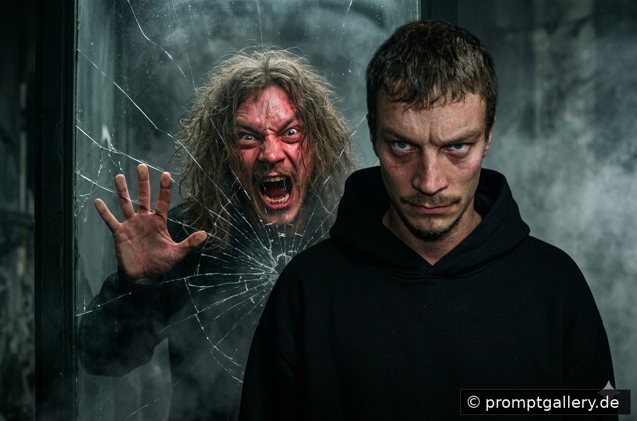 Ein Mann mit ernstem Blick blickt in die Kamera, während im Hintergrund ein Doppelgänger durch ein gesprungenes Glasfenster brüllt und seine Hand dagegen drückt. Diese dramatische Szene voller Spannung und Nebel deutet einen tiefgreifenden psychologischen Konflikt an.