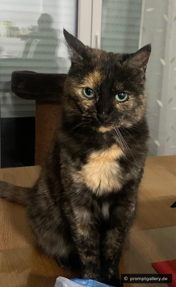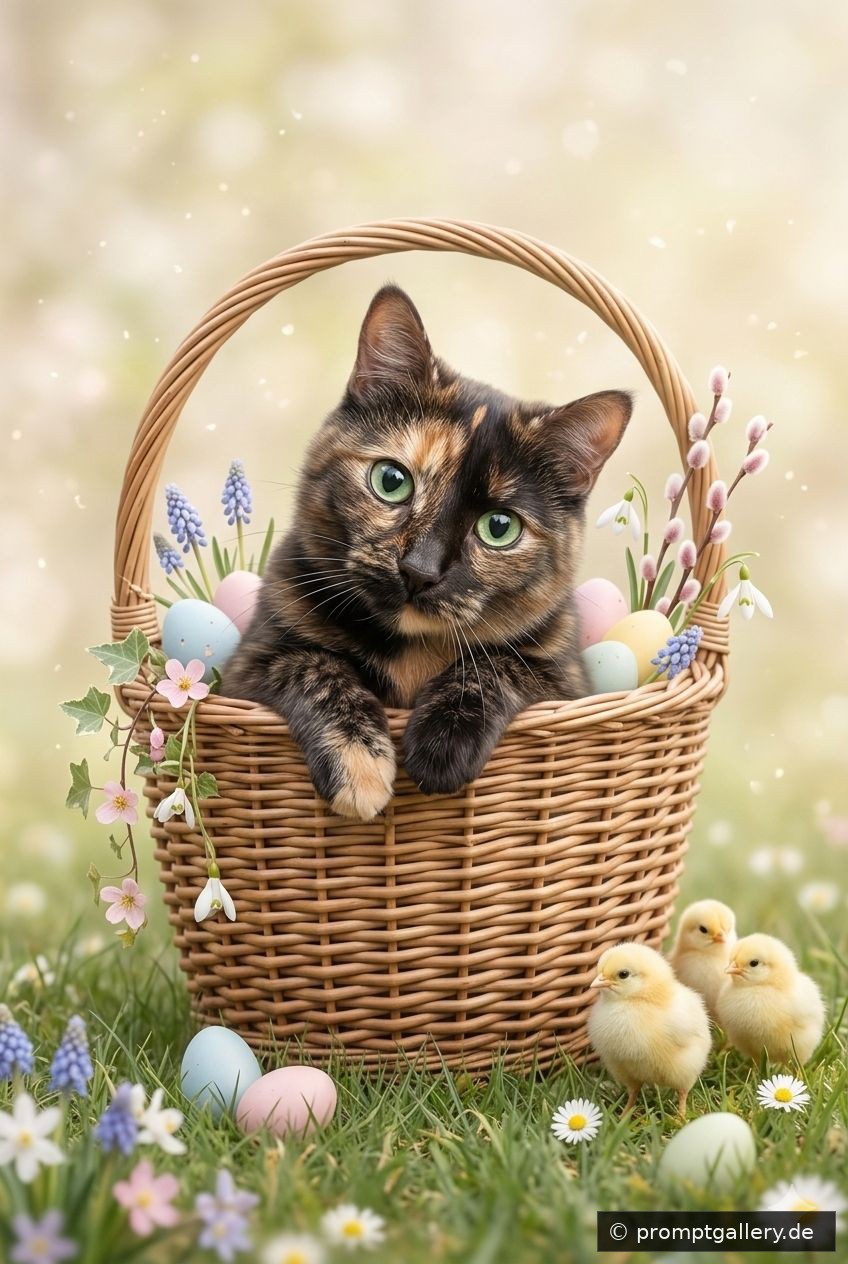 Künstlerisches Bild meiner Katze vom Referenzfoto im Hochformat Die Katze sitzt vollständig und harmonisch in einem hohen, natürlichen Weidenkorb. Sein Körper ist komplett im Korb, nichts verläuft außerhalb. Die Vorderpfoten liegen locker und natürlich über dem Korbrand. Der Kopf ist ein kleines Stück nach links geneigt, sanft näher an die Pfoten gelegt, wodurch ein besonders niedlicher, weicher Ausdruck entsteht. Große Augen blicken direkt zum Betrachter (WICHTIG). Der Blick wirkt zart, leicht von unten nach oben (Puppy-Eye-Effekt). Ohren weich und leicht asymmetrisch fallend. Das Gesicht ist sehr scharf mit extrem hohem Mikrodetailgrad, feine Fellstruktur klar definiert. Die Nase wirkt natürlich feucht und dezent glänzend mit realistischem Lichtreflex. Im Korb befinden sich einige Pastell-Ostereier, zarte Frühlingsblumen und rosa-weiße Weidenkätzchen (WICHTIG). Seitlich links hängen dezent und natürlich etwas Efeu und einzelne zarte Blüten aus dem Korb – keine hängenden Eier, nur florale Elemente. Vor dem Korb stehen rechts drei flauschige gelbe Küken locker im Gras. Einige vereinzelte Pastelleier liegen natürlich verteilt im Vordergrund (Eier nicht in einer Reihe oder dekorativ platziert). Farben weich, harmonisch und warm. Der Hintergrund ist frühlingshaft, sanft verschwommen mit cremigem Bokeh und schwebenden Lichtpartikeln. Insgesamt eine sehr weiche, harmonische, hochwertige Anmutung mit Fokus klar auf dem Hundegesicht. Am unteren Bildrand befinden sich einige kleine Frühlingsblüten und vereinzelte Gänseblümchen im Gras. Dieser Vordergrund ist leicht weichgezeichnet und erzeugt eine natürliche Tiefenwirkung. Kein sichtbarer Himmel, Hintergrund vollständig aus weichem Frühlingsbokeh und Lichtpartikeln