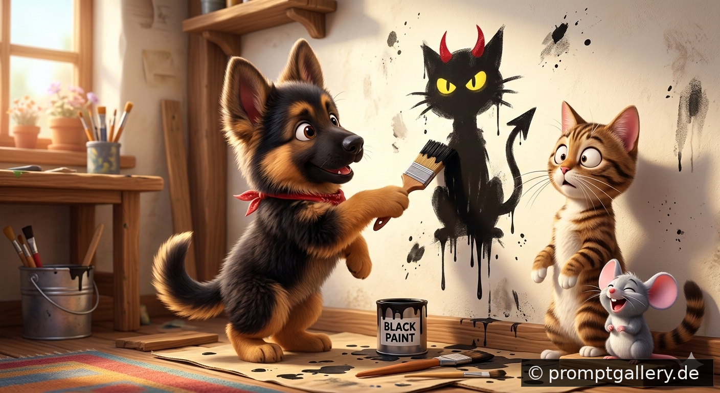 Erstelle eine urkomische Illustration im Pixar-Stil. Ein süßer, flauschiger Deutscher Schäferhund Welpe steht aufrecht auf seinen Hinterbeinen in halber Seitenansicht vor einer hellen Wand und malt eifrig mit einem Farbpinsel in einer Pfote die schwarze Silhouette einer aufrecht stehenden Katze mit Teufelshörnern und glühenden Augen an die Wand. Farbe tropft auf den Boden herunter. Eine niedliche, getigerte Katze mit großen, verdutzten Augen und langen Schnurrhaaren steht auftrecht in Seitenansicht daneben. Eine niedliche, flauschige graue Maus mit großen, zarten rosa Ohren und süßen schwarzen Augen schaut zu und lacht laut . Halbrealistischer Pixar-Stil. Perfekte Komposition. Urkomisch.
