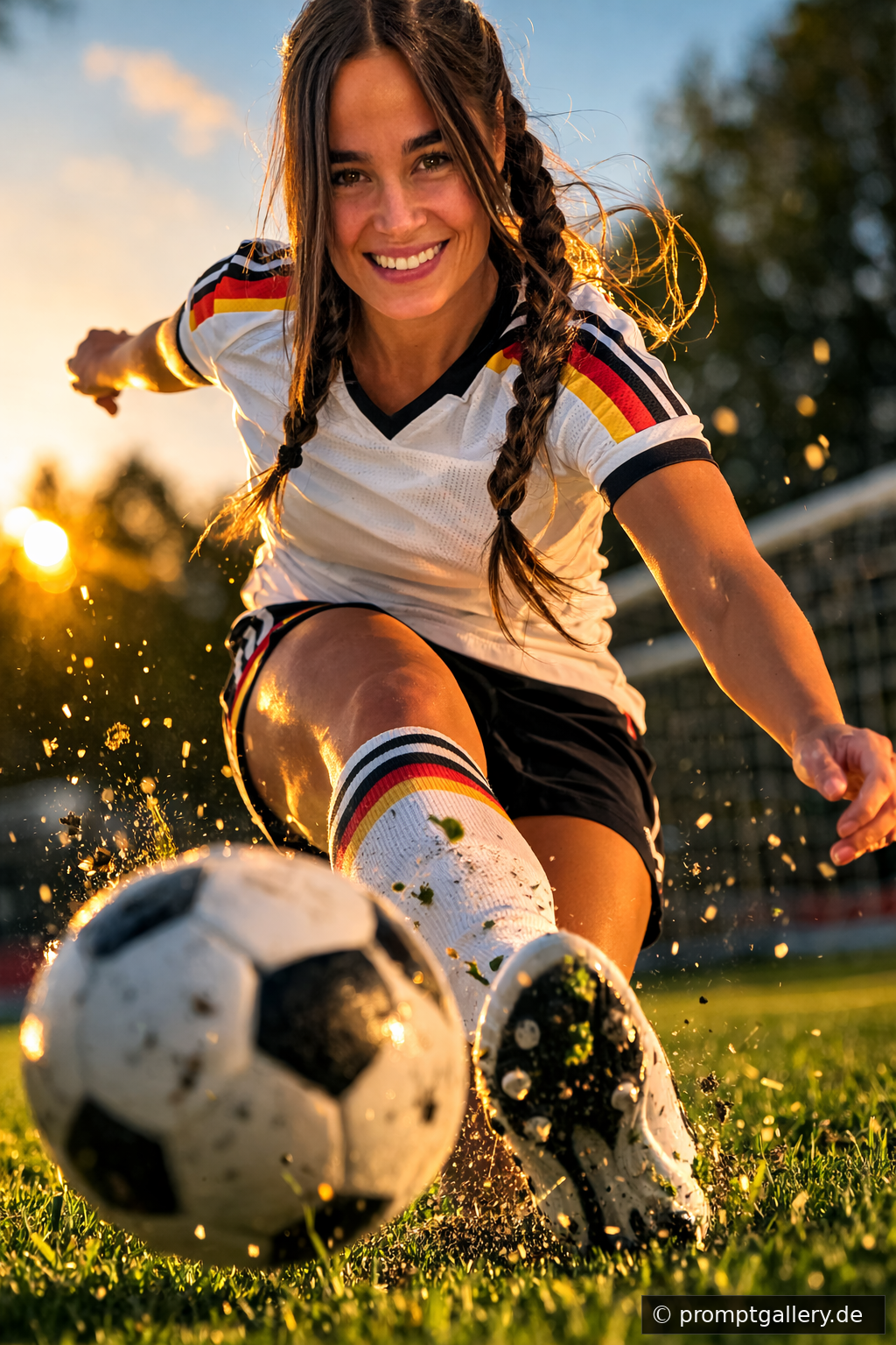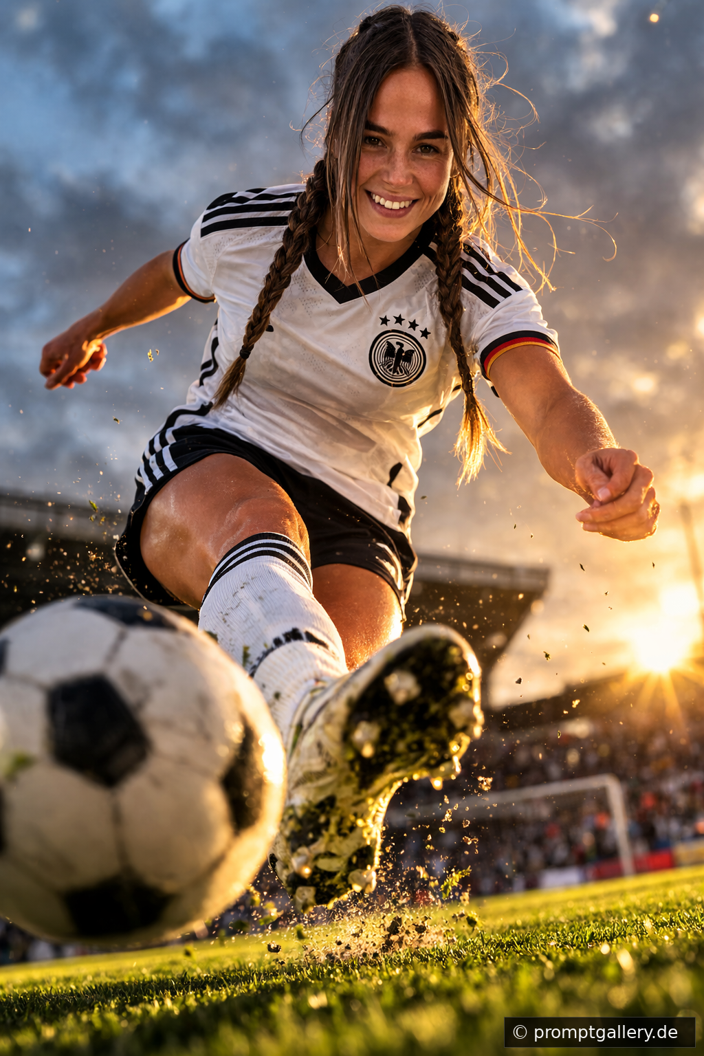 Ultra-realistische, filmische Sportfotografie auf einem Fußballplatz. Eine sportlich-athletische Frau, (Referenzfoto). Die Haaren zu zwei engen Boxer Braids geflochten, befindet sich mitten in einer kraftvollen Bewegung, während sie einen Fußball direkt in Richtung Kamera schießt. Sie trägt das Nationaloutfit der deutschen Fußballmannschaft mit Trikot, Shorts, Kniestrümpfen und Fußballschuhen mit Stollen (ohne Logos oder Marken). Extreme Perspektive: Die Kamera liegt direkt im Gras des Fußballfeldes auf Bodenhöhe. Ultra-Weitwinkelobjektiv (ca. 18 mm), leicht nach oben geneigt. Der Fußball ist extrem nah an der Linse, als würde er im nächsten Moment die Kamera treffen. Der schießende Fuß befindet sich direkt hinter dem Ball, und man sieht deutlich die Unterseite des Fußballschuhs mit den Stollen. Actionmoment eingefroren: Durch eine sehr kurze Belichtungszeit (High-Speed-Sportfotografie) ist die Bewegung eingefroren. Beim Schuss werden kleine Erdklumpen und Grashalme aufgewirbelt, die in der Luft schweben und um Ball und Schuh herum sichtbar sind. Licht und Schatten: Warmem goldenes Sonnenlicht der Abendsonne (Golden Hour) fällt seitlich über den Platz. Das Licht ist gerichtet und kontrastreich, wodurch lange Schatten im Gras entstehen. Die Sonne erzeugt ein feines Gegenlicht (Rim Light) entlang der Boxer Braids und der Silhouette der Spielerin. Dramatische Licht-Schatten-Kontraste im Gras sorgen für Tiefe und Struktur. Bildwirkung: Cinematischer Look, dynamische Komposition, hohe Detailtiefe im Vordergrund. Scharfer Fokus auf Ball und Fußballschuh, Hintergrund leicht unscharf durch geringe Tiefenschärfe. Die Szene wirkt wie ein episches Standbild aus einem Sportfilm.