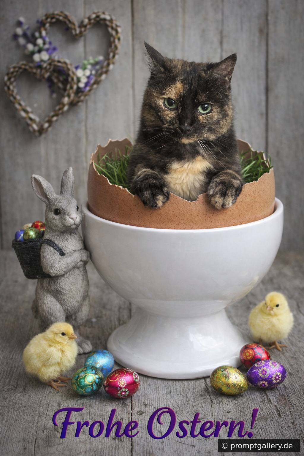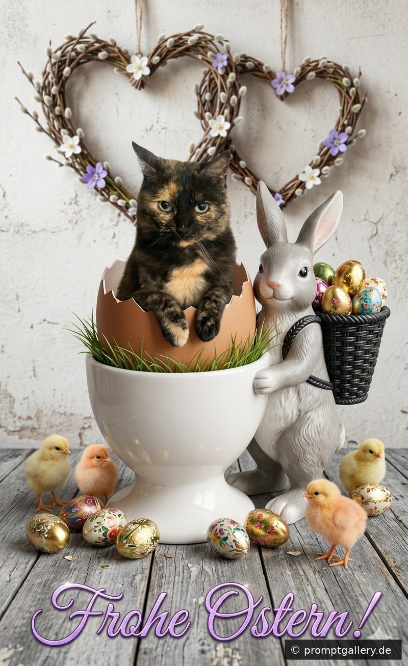 https://chatgpt.comErstelle bitte ein Bild mit meiner Katze als Referenzbild. Das Aussehen und Mimik übernehmen. Auf einen alten grauen Holzboden steht ein übergroßer weißer Keramikeierbecher mit einem süßen grauen Osterhasen der einen schwarzen Korb am Rücken trägt mit glänzend verschieden farbene verzierten Ostereier. Im Eierbecher ein große halbe braune Eierschale (an den Kanten gebrochen) mit etwas Gras in der Schale wo mein Hund gemütlich darin sitzt, seine Pfoten hat er am Rand der Eierschale abgelegt und schaut zufrieden/glücklich in die Kamera. Links und rechts des Eierbechers ein paar flauschige kleine Kücken und verteilt ein paar glänzend verzierte verschieden Farbene Ostereier. Im Hintergrund an der Wand hängen ineinander zwei geflochtene Palmkätzchenherzen mit ein paar kleinen weißen und violetten Blumen verziert. Unter dem Bild in violett glänzender schöner Schrift: "Frohe Ostern!"