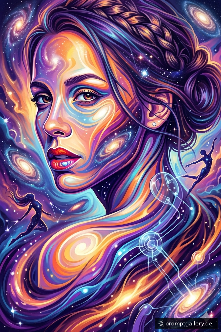 Eine atemberaubende, abstrakte Digitalmalerei, die ein elegantes weibliches Gesicht nahtlos in ein surreales, kosmisches Universum integriert. Die Komposition besticht durch fließende Linien, leuchtende Farben wie Purpur, Gold und Cyan sowie integrierte Sternengalaxien. Dieses Kunstwerk verbindet ruhige menschliche Züge mit der dynamischen Energie des Weltraums und fortschrittlicher technologischer Ästhetik. Ein Highlight für Liebhaber von modernem Surrealismus und psychedelischer Kunst.