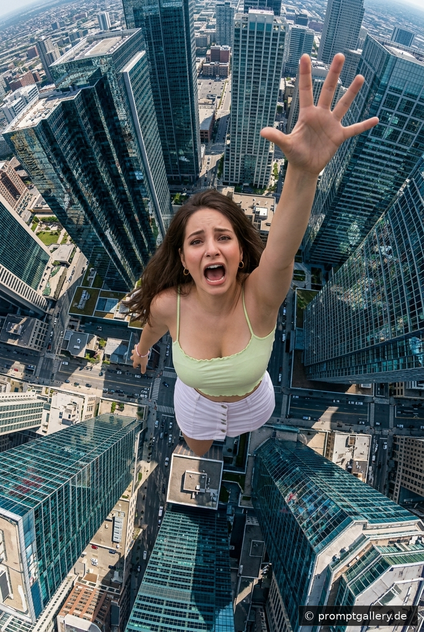Hyperrealistische 8K-Fisheye-Aufnahme aus der Vogelperspektive (Top-Down-View). Eine Frau (hochgeladenes Bild) fällt rückwärts aus extremer Höhe, Ihr linker Arm streckt sich verzweifelt nach außen, der Mund ist zu einem Schrei geöffnet. Unter Ihr erstreckt sich eine weitläufige Stadtlandschaft mit hoch aufragenden Glas-Wolkenkratzern. Winzige Autos und Hausdächer sind sichtbar. Die extreme Perspektive verstärkt das Gefühl von Schwindel und Tiefe. Helles Tageslicht, scharfe Schatten, lebendige Spiegelungen auf den Glasfassaden sowie eine dynamische cineastische Bildkomposition. Seitenverhältnis 2:3.