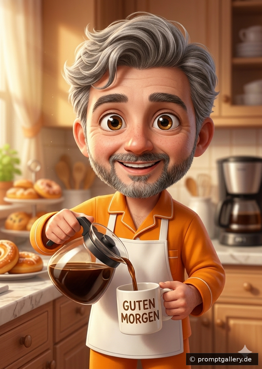 Eine Person (Referenzbild) mit großen, glänzenden braunen Augen, Brille und grauem Haar, trägt ein orangefarbenes Pyjama und eine weiße Schürze. Er gießt Kaffee aus einer Glaskanne in eine Tasse mit der Aufschrift "GUTEN MORGEN", ganz im Stil einer Disney-Zeichentrickfigur. Sein Gesichtsausdruck ist niedlich und puppenhaft, und er lächelt breit. Der detaillierte Küchenhintergrund ist hochauflösend und detailreich. Bildqualität: 8K Verhältnis: 5:7