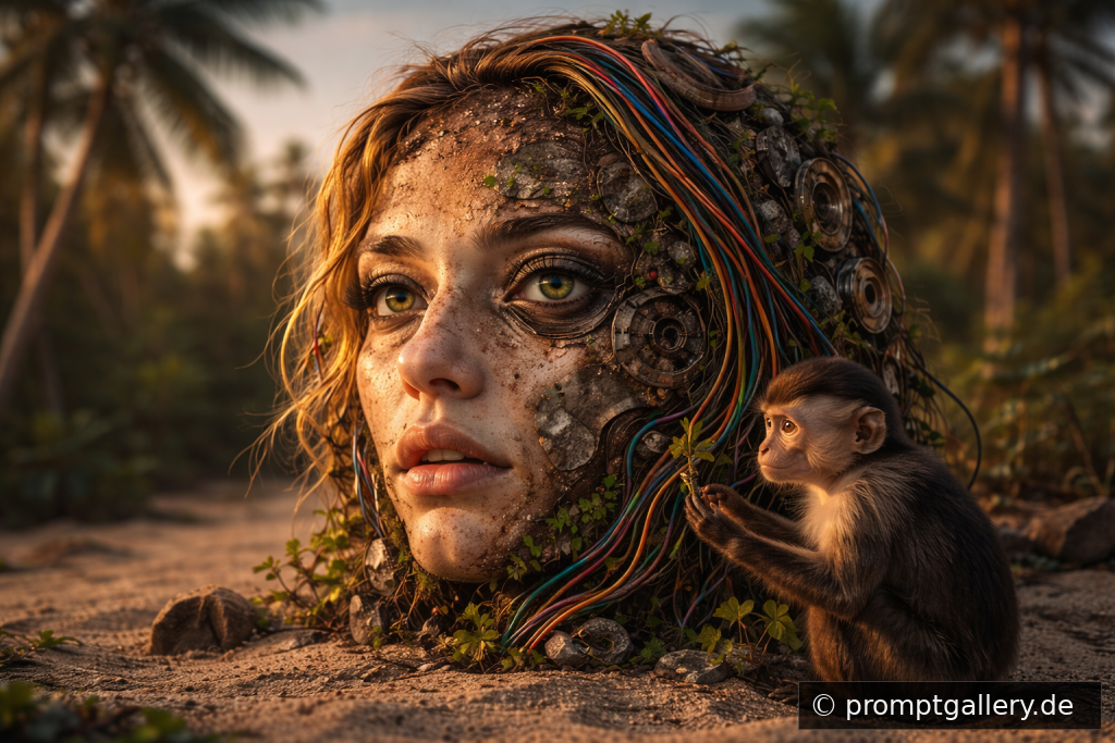 Ein eindrucksvolles surreal-cinematisches Portrait zum Global Recycling Day, das die Verbindung zwischen Mensch, Technologie und Natur symbolisiert. Ein gigantischer, teilweise im Sand vergrabener Kopf aus rostigem Metall, recycelter Elektronik, Kabeln und Zahnrädern steht für die Folgen von Konsum und Umweltverschmutzung – aber auch für Hoffnung durch Wiederverwertung. Moos, kleine Pflanzen und ein neugieriger Affe, der mit neu sprießendem Grün interagiert, vermitteln eine starke Botschaft über Nachhaltigkeit, Kreislaufwirtschaft und die Chance auf einen Neuanfang. Warmes Golden-Hour-Licht, extreme Detailtiefe und eine filmische Atmosphäre machen dieses Kunstwerk zu einer visuellen Metapher für Recycling, Umweltbewusstsein und Zukunftsverantwortung. 🌱♻️ Perfekt geeignet für Kampagnen, Awareness-Beiträge, Blogartikel oder Social Media rund um Umweltschutz, Ressourcenschonung und nachhaltige Innovation.