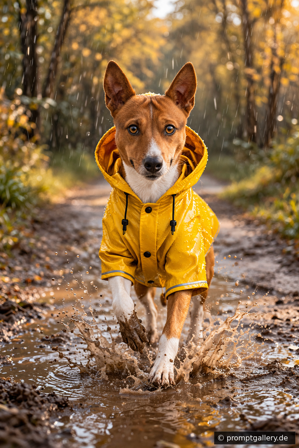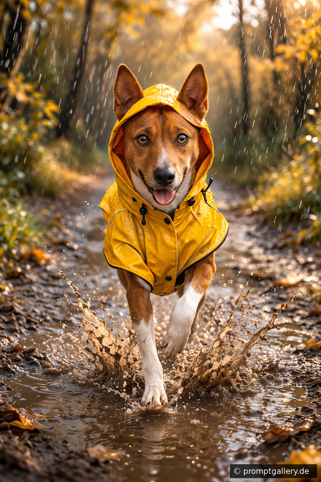 Ein beeindruckender Hund mit markanter Fellzeichnung und ausdrucksstarken Augen stapft durch einen matschigen Waldweg im strömenden Regen. Gekleidet in einen leuchtend gelben Regenmantel mit Kapuze, spritzt er dynamisch durch Pfützen, während Regentropfen auf dem glänzenden Stoff abperlen. Die Szene besticht durch dramatische Beleuchtung, warme Gold- und Brauntöne im Hintergrund sowie eine starke Tiefenschärfe. Hochdetaillierte, hyperrealistische Tierfotografie mit intensiver Stimmung und professioneller Ästhetik.