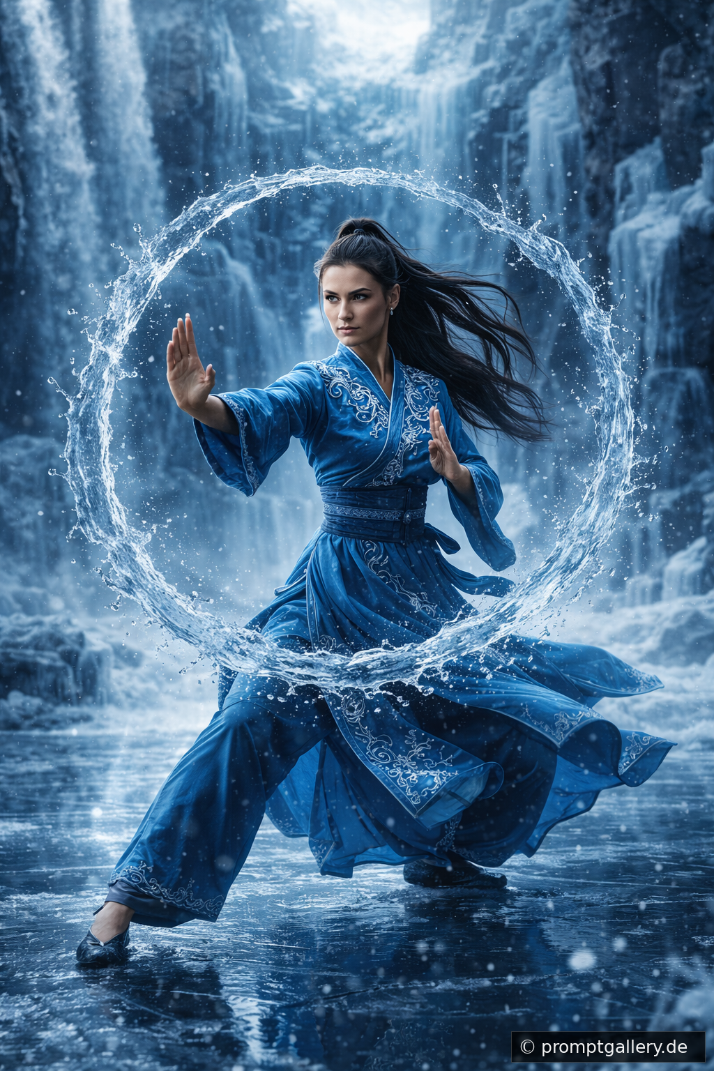 Eine atemberaubend realistische Szene zeigt eine kraftvolle Kung-Fu-Kämpferin in einem gefrorenen Canyon, umgeben von majestätischen Eisformationen und Wasserfällen. In einer dynamischen Kampfpose kontrolliert sie einen perfekt geformten Ring aus Wasser, dessen Tropfen detailreich in der Luft eingefroren wirken. Ihr elegantes blaues Kung-Fu-Gewand mit feinen Stickereien unterstreicht die Harmonie zwischen Stärke und Anmut. Die kühle Farbgebung, das dramatische Licht und die gestochen scharfe 8K-Qualität verleihen dem Bild eine epische, fast magische Atmosphäre.