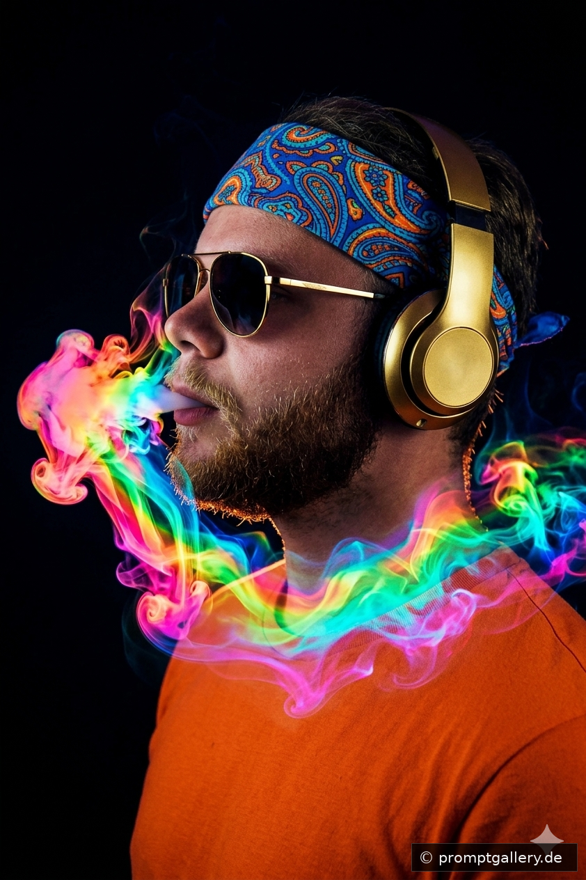 Tauche ein in eine Welt voller Farben! Dieses beeindruckende Porträt im 60er-Jahre Psychedelic-Stil kombiniert moderne Technik mit surrealer Kunst. Ein leuchtender Regenbogen aus Rauch, goldene Kopfhörer und ein kontrastreiches Design machen dieses Bild zu einem echten Blickfang für Musik- und Kunstliebhaber.